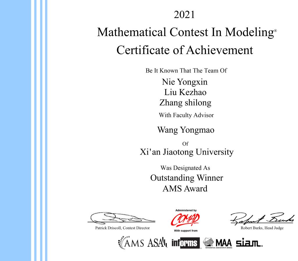 4月24日,2021年美国大学生数学建模竞赛和交叉学科建模竞赛(MCM/ICM)成绩揭晓,西安交大学子获得大赛Outstanding Winner奖(最高奖)1项、Finalist奖(次高奖)13项、Meritorious Winner奖36项、Honorable Mention奖88项、冠名奖(AMS Award)1项。学校已连续四年获得大赛Outstanding Winner奖。