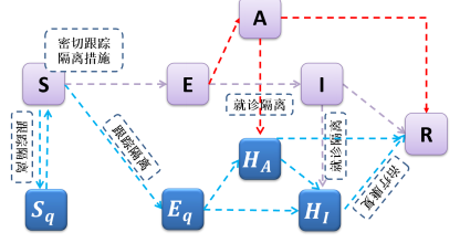 图1:密切跟踪隔离新冠传播模型流程图,其中HA表示报告的无症状感染者,HI表示报告的确诊病例。Sq ,Eq表示隔离的密接人数。其它变量为通常熟知的模型变量。