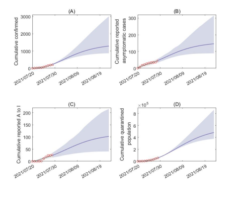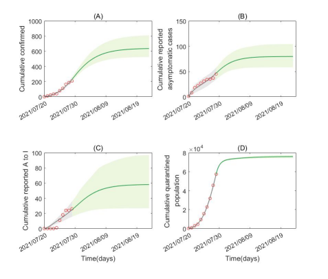 2.3防控加强,即从7月29日开始加强相关防控措施。不妨假设人均日接触数c开始指数递减。据模型预测:截至到8月20日,累计新增确诊633人(95%CI:[523,805]),累计新增无症状感染者80人(95%CI:[58,104]),如图4所示。当考虑更多防控措施的进一步加强,比如个体防护、检测率等的提升,疫情规模有可能进一步下降。