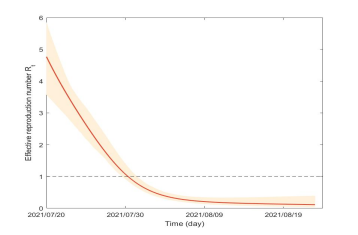 2.2基准预测,即维持国内7月29日之前的防控力度。通过同时拟合多源数据 (每日确诊病例数、无症状感染数、隔离人数、新增无症状转确诊病例数等),估计了系统的未知参数,预测了疫情在近期的走势。当维持国内7月29日之前的防控力度,如图2-3所示,此次疫情的拐点可能出现在8月1日(95%CI: [7月31日,8月2日],而有效再生数将在7月31日(95%CI:7月30日至8月1日)之后维持在1以下。据模型预测:截至到8月20日,累计新增确诊925人(95%CI:[733,1364]),累计新增无症状感染者109人(95%CI:[77,151])。