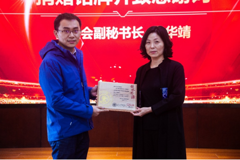 教育基金会方华靖副秘书长为校友代表刘愛蓉颁发捐赠铭牌并致感谢辞,代表基金会和学校对数学系87级校友的奖助金捐赠表示感谢,同时祝愿果冻传媒