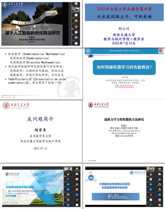 12日全天,学院举办了系列特色学科讲座,邀请各领域专家向营员们介绍数学的应用及研究现状。其中,徐宗本院士谈到了如何突破机器学习的先验假设;孙建永院长以应用为切入点,谈到人工智能在优化算法中起到的作用;刘小川教授将数学理论知识和“水波”相结合,引入了孤立子、可积系统的概念,为学习数学的同学们打开了一扇新的大门;侯延仁教授讨论物理中的数学,介绍了流体力学方程组数值方法的研究;杨家青教授主要介绍了应用数学中的反问题;薛江教授和姜丹丹教授分享了大维随机矩阵谱理论等无线通信的数学理论基础,使同学们了解到数学在通信领域的广泛应用;鲁红亮教授向同学们介绍了组合数学与图论的知识。