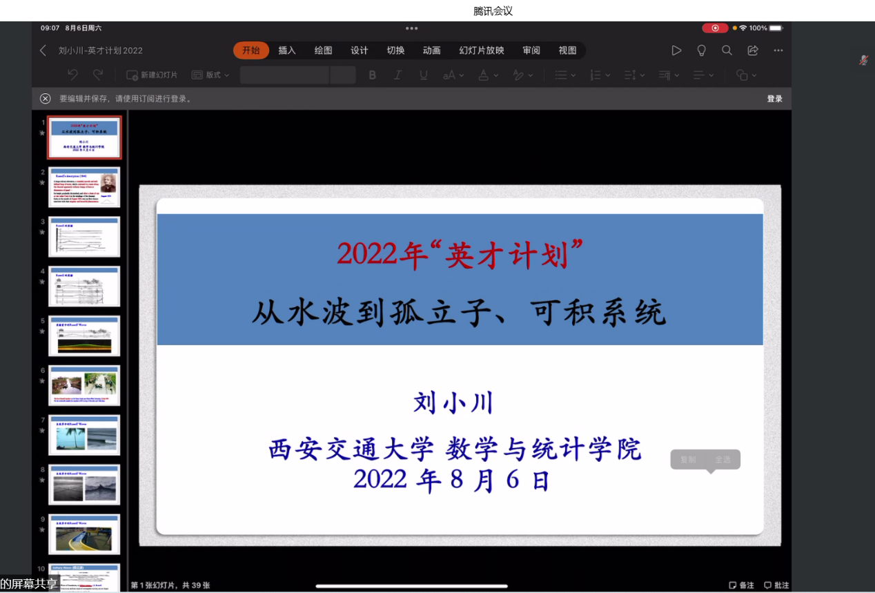 第一场报告由刘小川教授带来,题目为“从水波到孤立子、可积系统”。刘小川教授结合多年来从事数学物理研究的丰富经验,以视频为切入,通过水波的传播和相互作用这一物理现象,过渡到应用数学方法来解决物理问题,且巧妙的解释了在物理现象的驱动下,数学内部发展的过程。更加激发了英才计划同学对数学学习的兴趣,鼓励大家透过生活中的现象和问题,去发现问题背后隐含的数学方法,探索数学和其他学科交叉碰撞的火花。