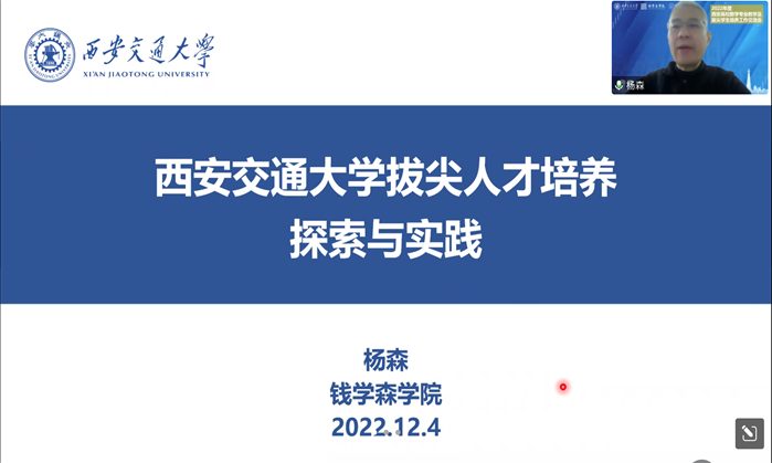 在拔尖人才培养过程中的探索与实践。杨森教授首先对我校基础学科人才培养的基本情况做了详细说明,然后结合数学和物理两个试验班的毕业生深造和从事基础研究的实例,着重讲解了钱学森教育思想引领下的双院育人荣誉教育机制以及 “服务国家重大需求、探索重大科学问题、依托国家科技计划”的育人措施。