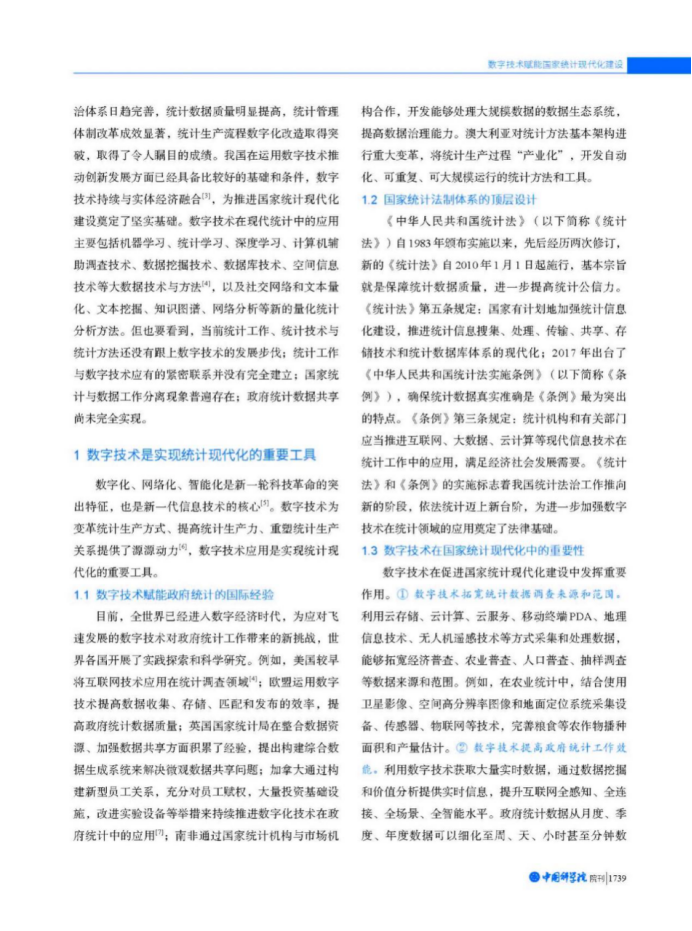 国家统计现代化是国家治理现代化的有机组成部分。数字技术为变革统计生产方式、提高统计生产力、重塑统计生产关系提供了源源动力,成为推进统计现代化建设的重要前提。文章总结了数字技术赋能政府统计的国际经验,国家统计法制体系的顶层设计,以及数字技术在促进统计现代化中的重要性;分析了国家统计现代化建设存在的主要挑战。