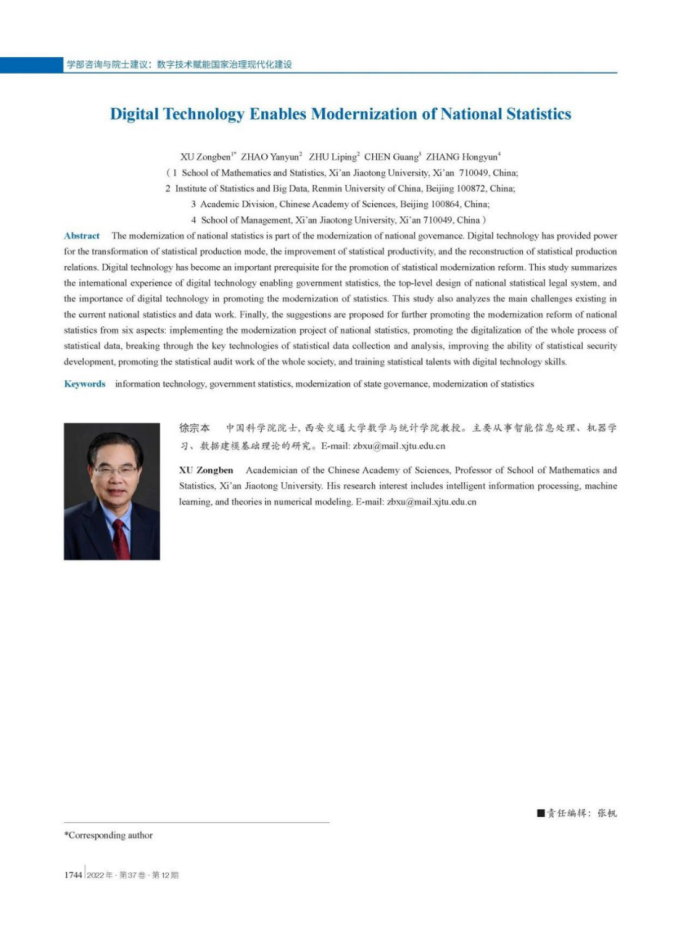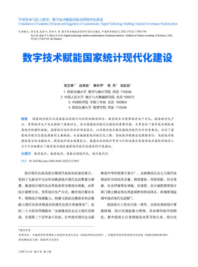 徐宗本院士在《中国科学院院刊》2022年第12期发表重要文章《数字技术赋能国家统计现代化建设》。