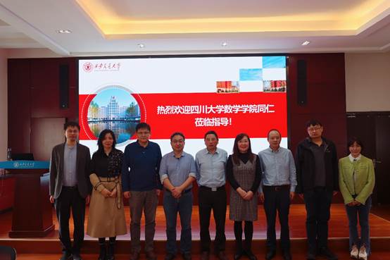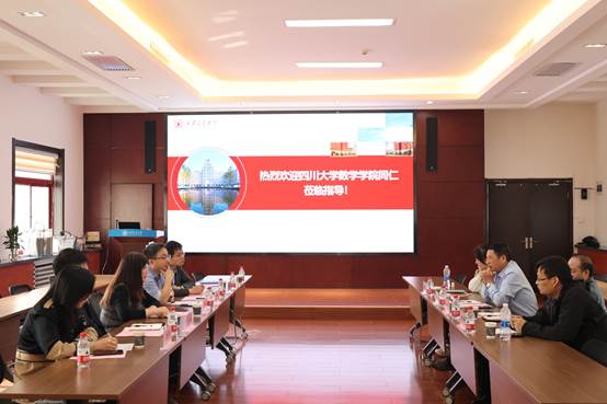 为提升学科建设能力,加深校际间交流,2023年10月9日上午,四川大学数学学院院长、副院长寇辉、副院长连增、党政办公室主任杨亚岚一行四人来我院调研交流。学院院长孙建永、党委书记颜莉、副院长孙剑、院长助理郭士民、统计系教师姜丹丹以及综合办公室主任罗文成参加此次调研交流会。会议在数学楼2-1会议室召开,孙建永院长主持会议。