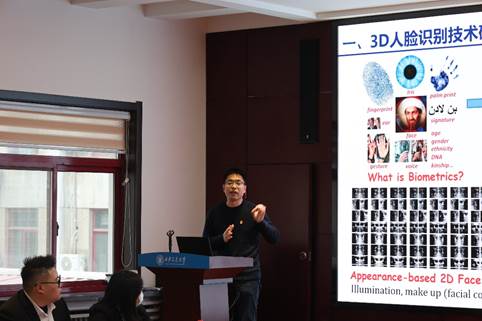 在党建和业务工作交流环节,支部党员、陕西西图数联科技有限公司创始人李慧斌教授以“从学术研究到产业落地”为主题展开报告。他从3D人脸识别技术的研究背景、微分几何系列技术、深度学习系列技术以及技术产业化实践等方面展开介绍人脸识别技术的最新成果,该项成果的产业化落地,打通了“基础研究—应用基础研究—技术创新—产业化”双向循环的通道,成为学院产学研深度融合的典型。