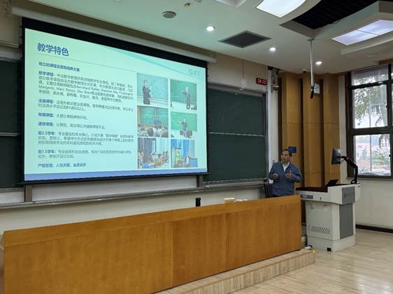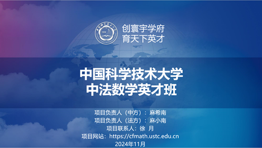 致欢迎辞,对中国科学技术大学中法数学英才班师生的来访表示热烈欢迎,并期待今后开展更多的学术交流活动,增进友谊、深化合作。随后,中国科学技术大学麻希南教授首先从办学理念、培养目标、培养计划、教学团队、教学管理、教学特色、招生就业、国内交流与国际合作等方面介绍了中法数学英才班的基本情况,针对专业基础课程、专业核心课程、专业选修课程、自由选修课程体系部分做了重点介绍。