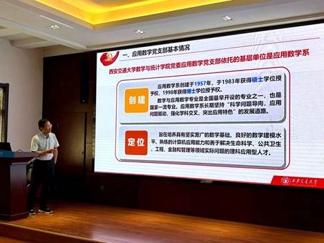 应用数学党支部书记祖建分享了创建第二批“全国党建工作样板党支部”的相关经验,详细阐述了支部“七个有力”的实践路径。通过党建引领,支部在教育教学、科研攻关、人才培养、团队建设及社会服务等领域取得突出成果,为党建引领系所发展提供了可借鉴的样板经验。
