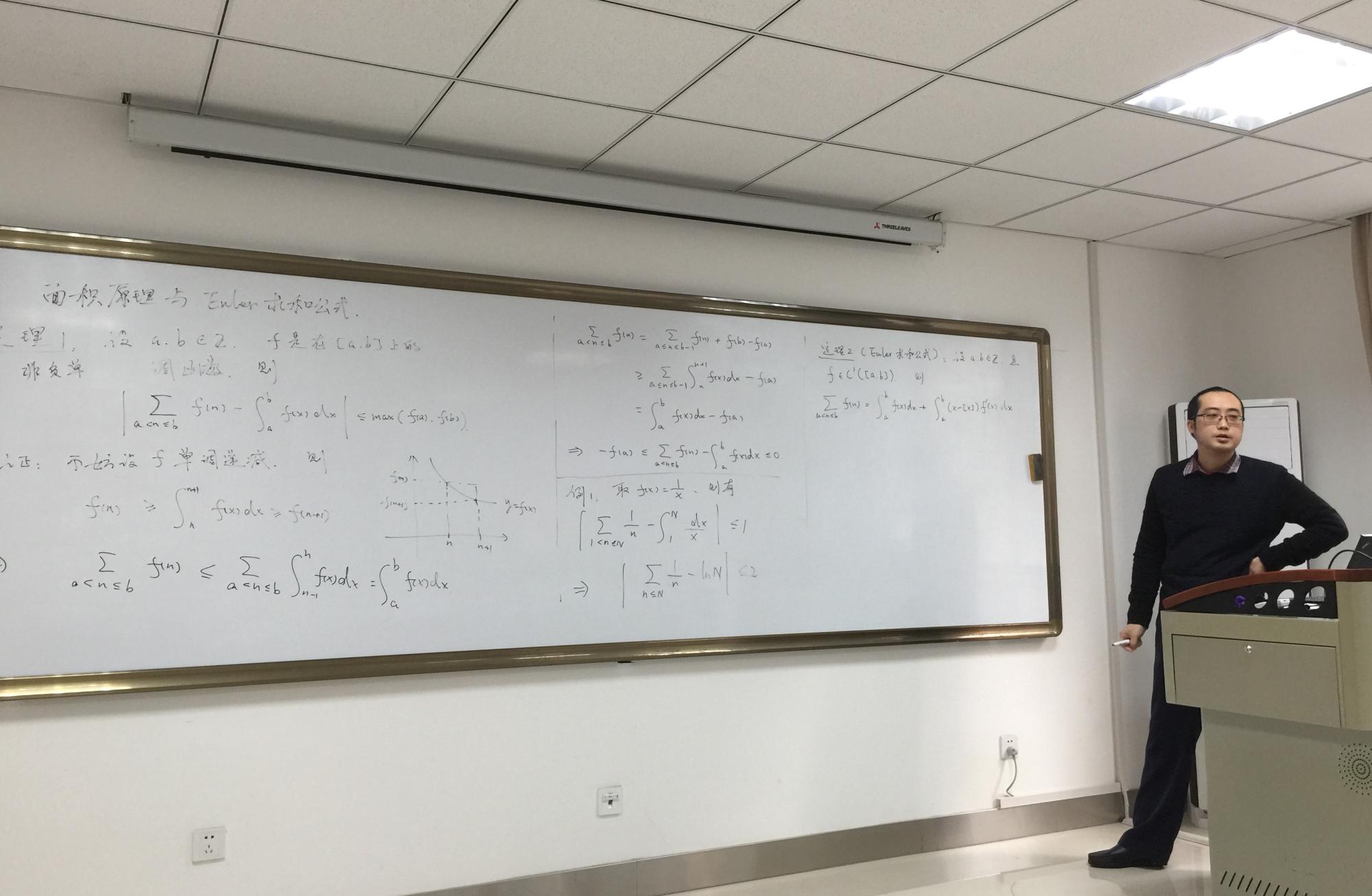 介绍完举办活动的初衷以及交大相关课程的建设情况之后, 空军工程大学刘卫江副教授与我院陆亚明副教授分别针对《变号级数的敛散性》及《面积原理与Euler求和公式》讲授了示范课,并谈及了长期授课过程中所积累的经验和发现的问题。
