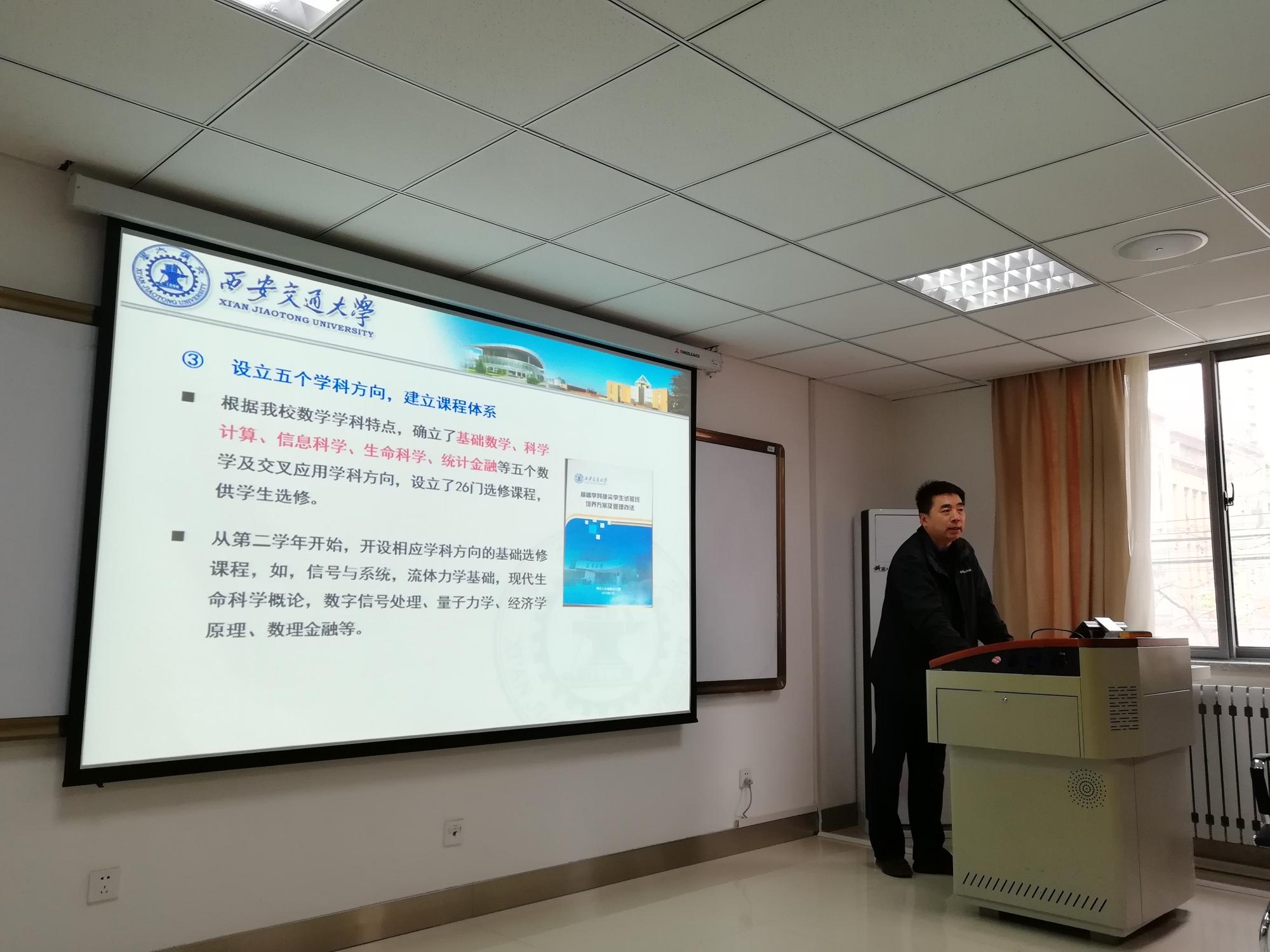 师生们的热情接待,希望借鉴交大在拔尖创新人才培养模式的创新性改革,尤其是在试验班学生的培养方案设置、学生管理等环节的成熟做法,同时也热情欢迎交大师生到中山大学交流参观。许老师向参会师生简单介绍了中山大学的历史沿革、数学学院的创立与建设情况、数学学科拔尖计划的人才培养脉络和特色亮点,着重介绍了该校“小班教学、配备导师”的拔尖人才培育理念,以及适当减少招生数量、有效提升生源质量等具体措施。