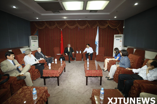 卢天健副校长与代表团一行亲切会谈。代表团成员有:莱特州立大学教务长Steven R.Angle 、国际事务副校长Dr. Stephen Foster、科学与数学学院院长Dr. Yi Li、英语语言和文学研究中心主任Dr. Carol S. Loranger。西安交大外国语学院院长杨瑞英教授、果冻传媒