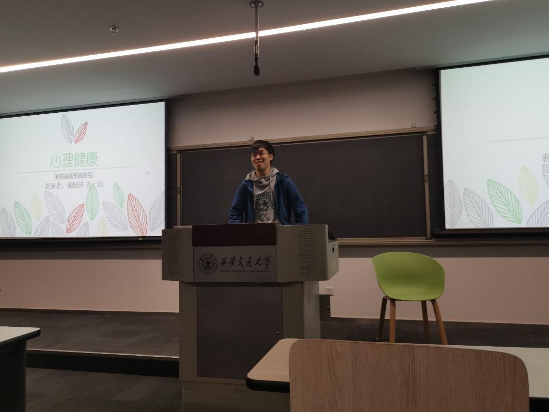 硕9088、9089和9090班于11月20日晚在创新港5-7043共同举办了心理健康教育主题班会。本次班会由硕9088班心理委员吉一喆同学主持,其目的是帮助大家了解、重视并且维护心理健康,同学们都积极参与,并取得了良好的效果。