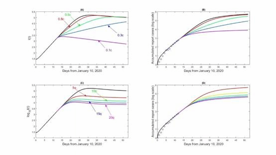 文中进行敏感性分析,讨论了1月22日前武汉采取的防控措施的有效性以及在降低再生数中的重要作用。预测结果显示从23日起加强控制措施,报告病例数会在一个周后出现明显的下降,即加强的控制措施会在一个周后为产生明显效果。进一步分析1月23日后武汉封城策略对其它地区疫情的影响,基于武汉到北京的航班、铁路等信息,计算武汉封城前后对北京疫情的影响,表明武汉封城(即北京无来自武汉输入病例)后,北京在未来7天的病例数将降低91.14%,这说明了武汉封城对全国疫情防控的关键作用。