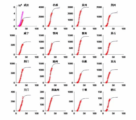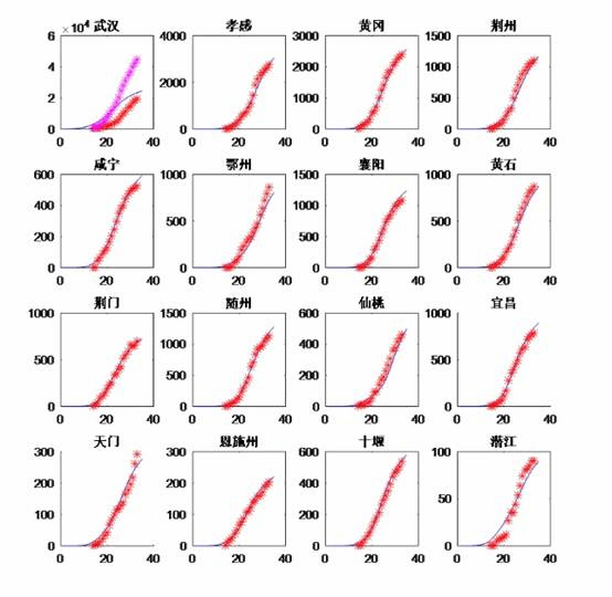 图2:模型拟合的结果。蓝线是模拟结果,红星号是各个城市的累计数据,紫色星号是全国累计数据。