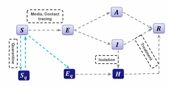 根据COVID-19传播机理,将自然传播过程的人群分为易感者类(S)、潜伏者类(E)、感染者类(有症状)(I)、感染者类(无症状)(A)、住院者类(H)和恢复者类(R)。依据严格的围堵缓疫策略,又将感染者密切接触的人群分为隔离的易感者类(Sq)和潜伏者类(Eq)。通过感染者密切接触追踪,假设q比率的接触者被隔离,其中被隔离的个体若被感染,则该个体隔离在Eq仓室,否则隔离在Sq仓室。根据如下的流程图,容易得到相应的动力学模型: