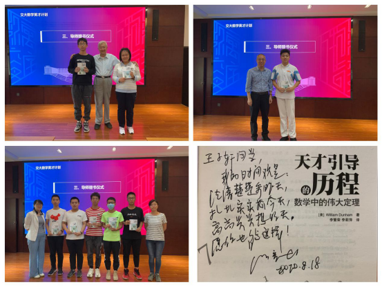 疫情前后,各指导教师和学生开展了线上线下系列交流活动,发掘研究兴趣、指导科研训练选题,充分为学生答疑解惑。作为导师,中科院院士徐宗本、国家教学名师马知恩、领军学者蒋耀林为每一位学生赠送书籍《天才引导的历程—数学中的伟大定理》,并对每一位学生寄语,希望学生们从数学中体会理性、智慧之美,鼓励学生们成为“伟大”的人。