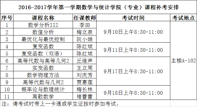 数学学院2016-2017学年第一学期本科专业课程补考安排
