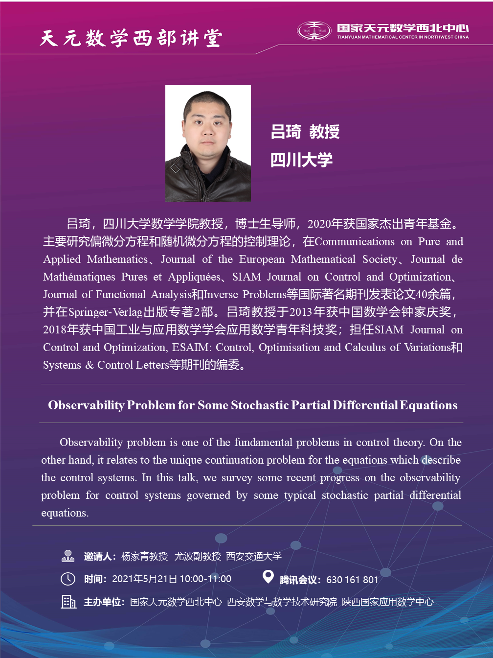 【天元数学西部讲堂】四川大学吕琦教授学术报告通知(2021.5.21)