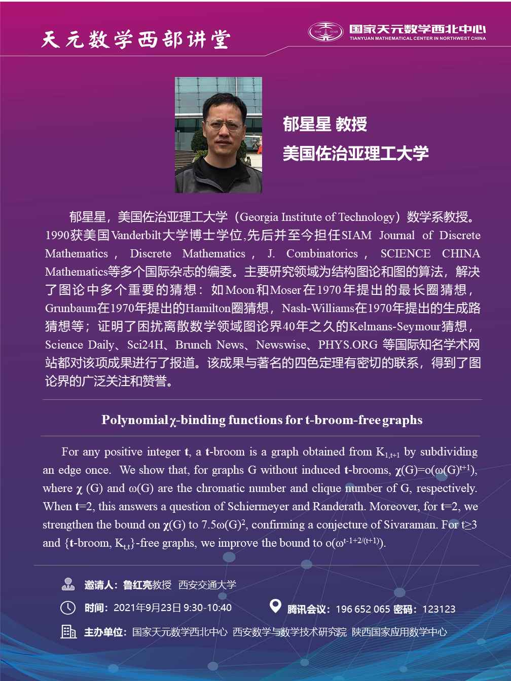 【天元数学西部讲堂】美国佐治亚理工大学郁星星教授学术报告