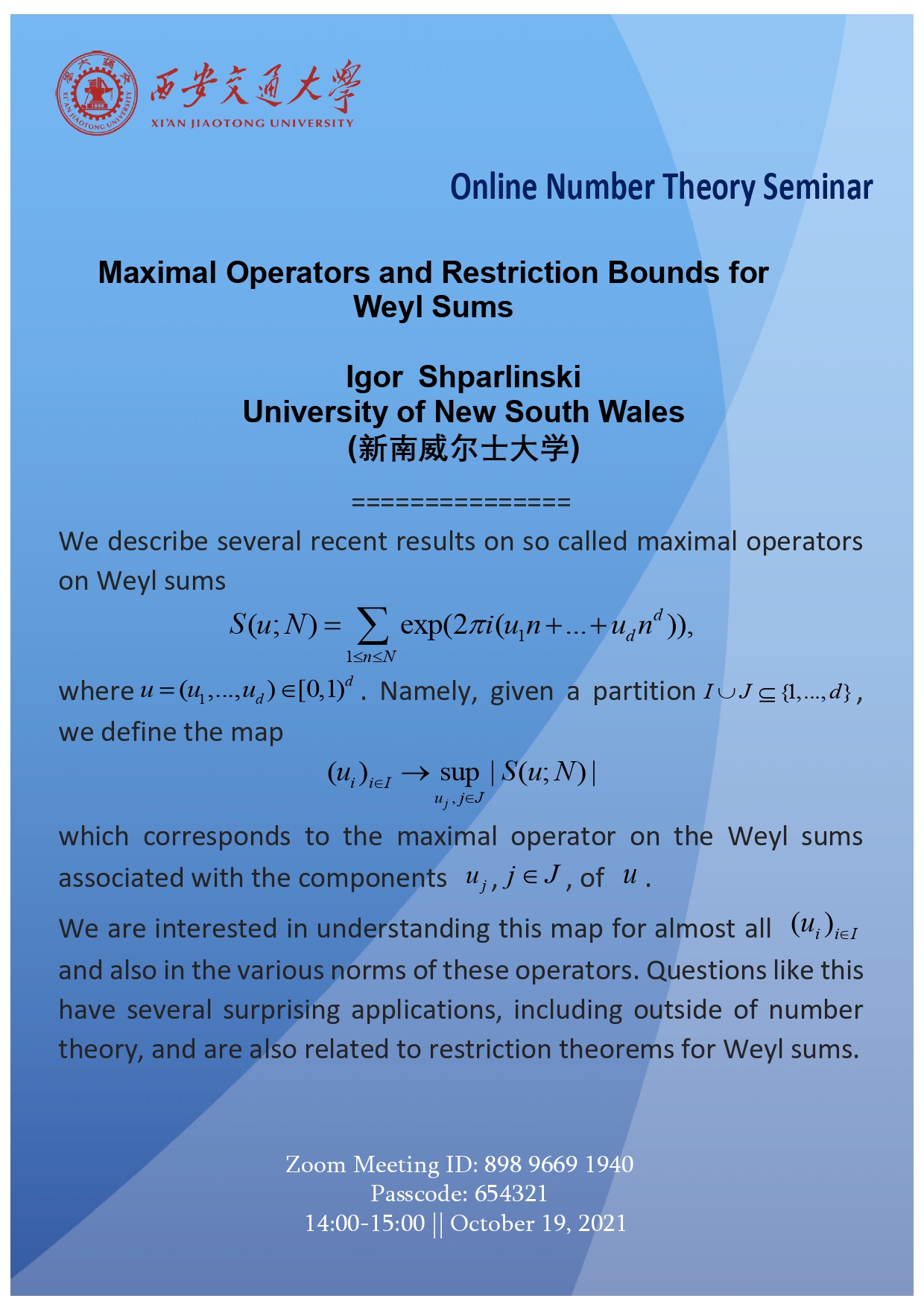 【Online Number Theory Seminar】新南威尔士大学Igor Shparlinski教授学术报告通知