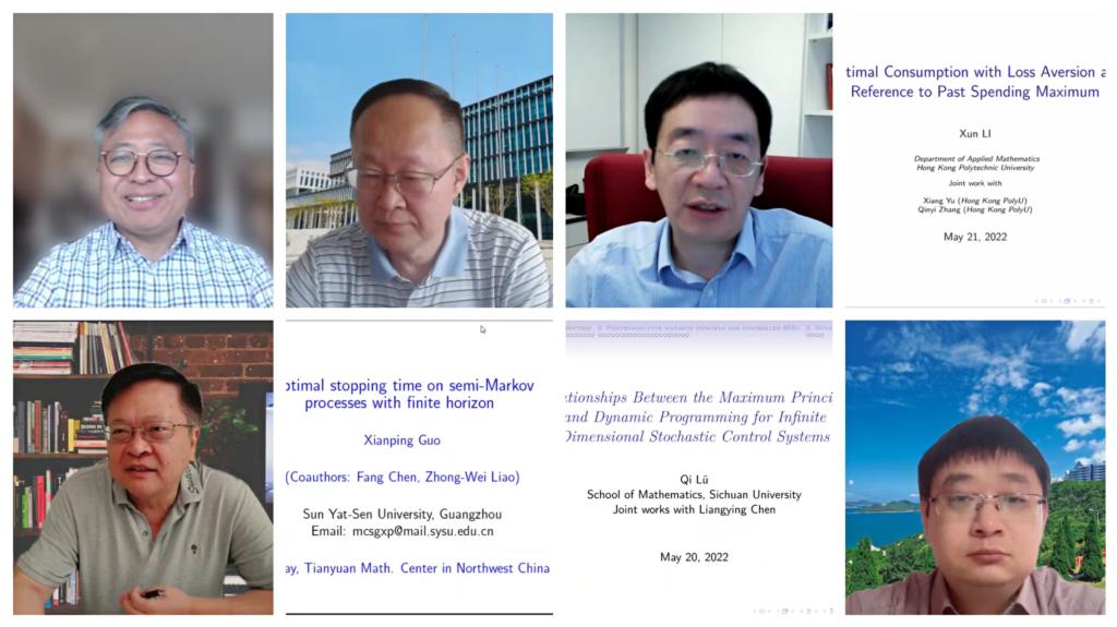 开幕式后,哥伦比亚大学周迅宇教授,南方科技大学李仲飞教授,香港理工大学、新加坡国立大学戴民教授,香港理工大学李迅教授,南方科技大学熊捷教授,中山大学郭先平教授,四川大学吕琦教授,香港科技大学蔡宁教授等金融和数学领域的知名专家带来了16场精彩报告。报告内容涉及家庭最优购房、投资、消费策略,基于深度学习的最优停时算法,违约传染和最优跟踪投资组合相关问题,随机赋范模中的Schauder不动点定理及其对条件Nash均衡的应用等前沿热点问题。专家们分享了各自的科研成果,并通过线上问答同与会学者交流研究经验。