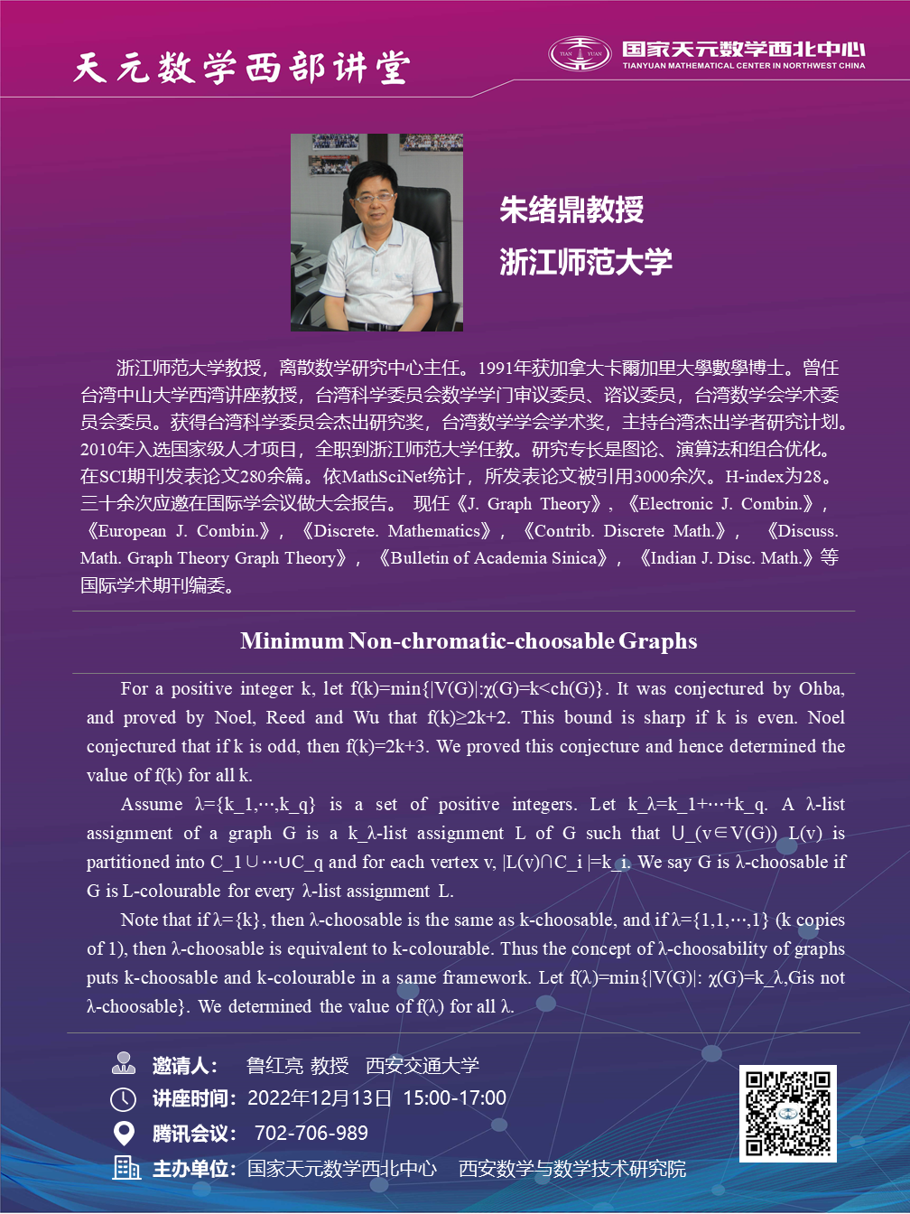 【天元数学西部讲堂】浙江师范大学朱绪鼎教授学术报告