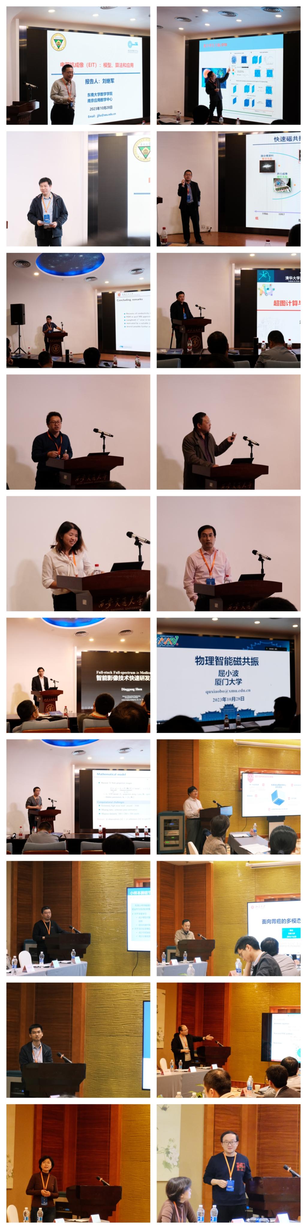 曾薇教授和与会专家共同主持。会议期间,与会专家聚焦医学成像与影像分析的数学理论与方法,讨论其在MR/CT/多模态医学成像与影像分析领域的应用,以促进数学反问题、人工智能、机器学习、物理成像等理论方法与医学影像应用间的交叉与融合。会议邀请了20位数学与医学影像领域的专家依次展开讲座报告:东南大学刘继军教授、电子科技大学尧德忠教授、电子科技大学李纯明教授、中科院深圳先进研究院梁栋研究员、香港中文大学金邦梯教授、清华大学高跃副教授、中科院数学与系统科学研究院陈冲副研究员、上海交通大学王利生教授、上海交通大学张小群教授、上海大学应时辉教授、上海科技大学沈定刚教授(联影智能联席CEO)、厦门大学屈小波教授(线上)、清华大学包承龙助理教授、中山大学姚正安教授、河南大学庞志峰教授、北京大学张立研究员、之江实验室林宏翔副研究员、果冻传媒