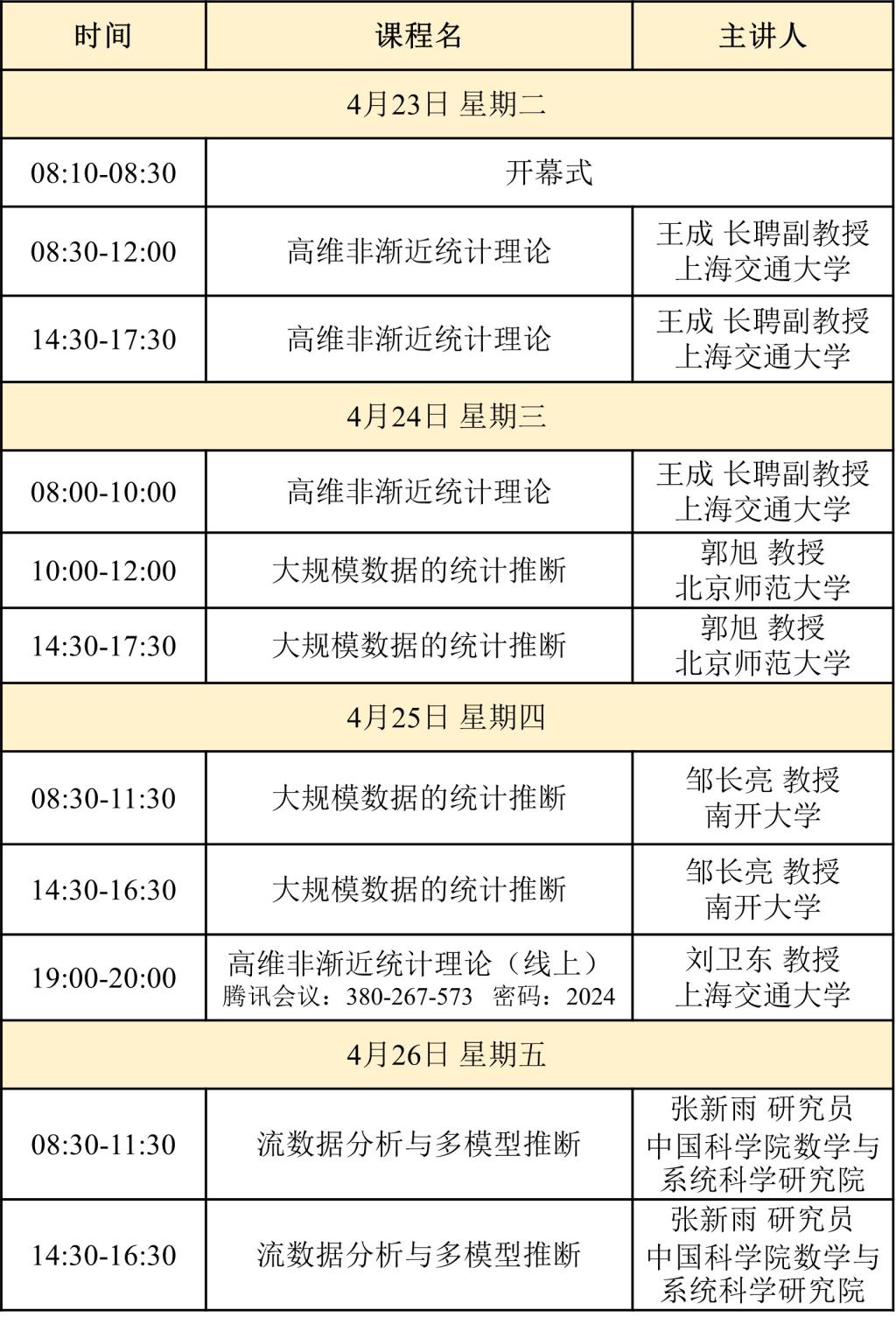 该讲习班是国家天元数学西北中心2024“数据科学与医疗健康”主题年活动之一,共开设“大规模数据的统计推断”“高维非渐近统计理论”和“流数据分析与多模型推断”三门课程,将详细介绍大数据分析的统计学原理和方法,包括大规模数据的统计推断、流数据分析、多模型推断等领域的经典结果和前沿问题;讲授最新的研究方法和核心理论工具,如高维非渐近统计理论、大规模数据的FDR控制、基于流数据的函数型数据的统计推断等;介绍健康大数据的智能处理和分析方法。