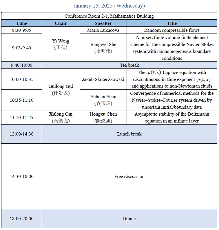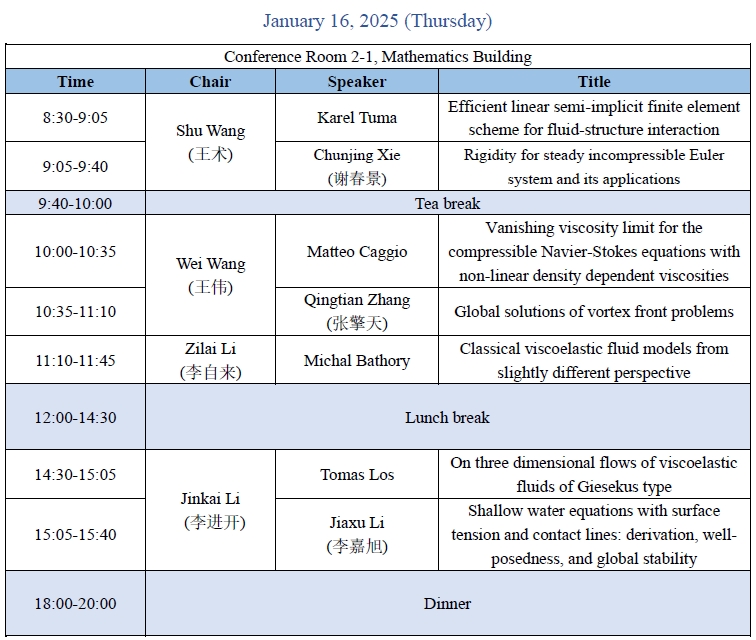 The mathematical study of partial differential equations in fluid mechanics is an important area of research in the field of partial differential equations, with significant theoretical and practical implications. In recent years, this field has advanced rapidly, with numerous breakthroughs in general theory and special solution theory. Czech mathematicians developed their own system for studying fluid mechanics equations and achieved significant research results. At the same time, many Chinese mathematicians have had close exchanges and long-term collaborations with Czech mathematicians working on mathematical fluid dynamics. The conference will serve as a forum for reporting new research breakthroughs, exchanging research ideas, and planning new collaborative research during and after the conference.