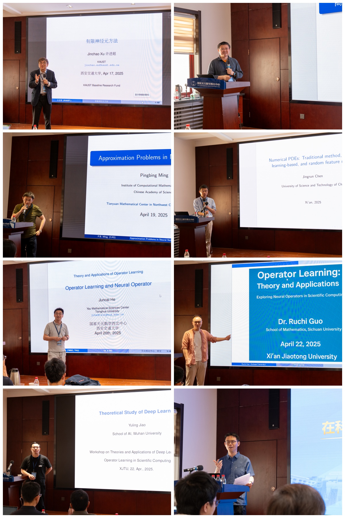 会议期间,阿卜杜拉国王科技大学许进超教授、中国科学院数学与系统科学研究院明平兵研究员、武汉大学焦雨领教授、中国科学学院数学与系统科学研究院谢和虎研究员、中国科学技术大学苏州高等研究院陈景润教授、四川大学郭汝驰特聘研究员、清华大学丘成桐数学科学中心何俊才助理教授等7位学者分别讲授了《有限神经元方法与训练算法》、《神经网络的数学理论》、《高维多尺度、多物理问题的深度学习方法》和《算子学习的理论与应用》等四门课程。与会学者们与专家围绕深度学习理论、相关前沿算法以及工业软件内算法的应用等关键议题,展开了广泛而深入的探讨,思想的火花在交流中不断碰撞,为讲习班增添了浓厚的学术氛围。