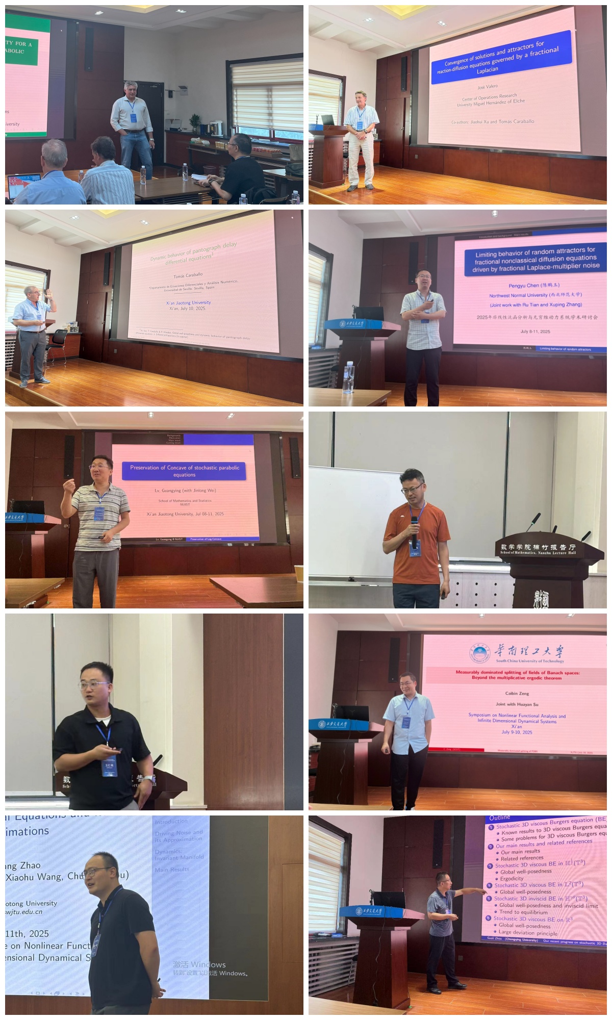 开幕式后会议报告随即开始。巴西科学院院士、巴西圣保罗大学Alexandre N. Carvalho教授、西班牙塞维利亚大学Tomás Caraballo教授、西班牙埃尔南德斯大学José Valero教授、西北师范大学陈鹏玉教授、南京信息工程大学吕广迎教授、安徽大学钮维生教授、贵州师范大学王仁海特聘教授、华南理工大学曾才斌教授、重庆大学周国立教授、西南交通大学赵君一郎副教授等10余名海内外专家先后作精彩报告。报告内容涵盖了非线性泛函分析、无穷维动力系统、偏微分方程、随机分析等多个基础数学学科领域。报告人详细介绍了他们所取得的最新科研进展,并就后续的研究问题和可能遇到的挑战与参会学者展开深入交流讨论。