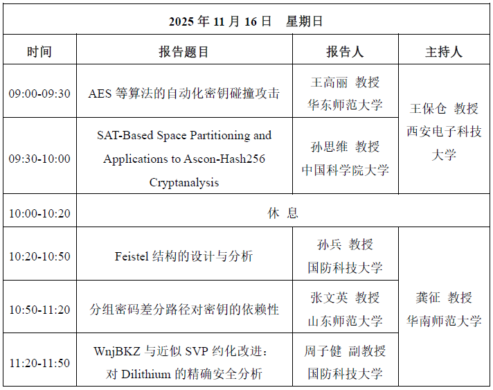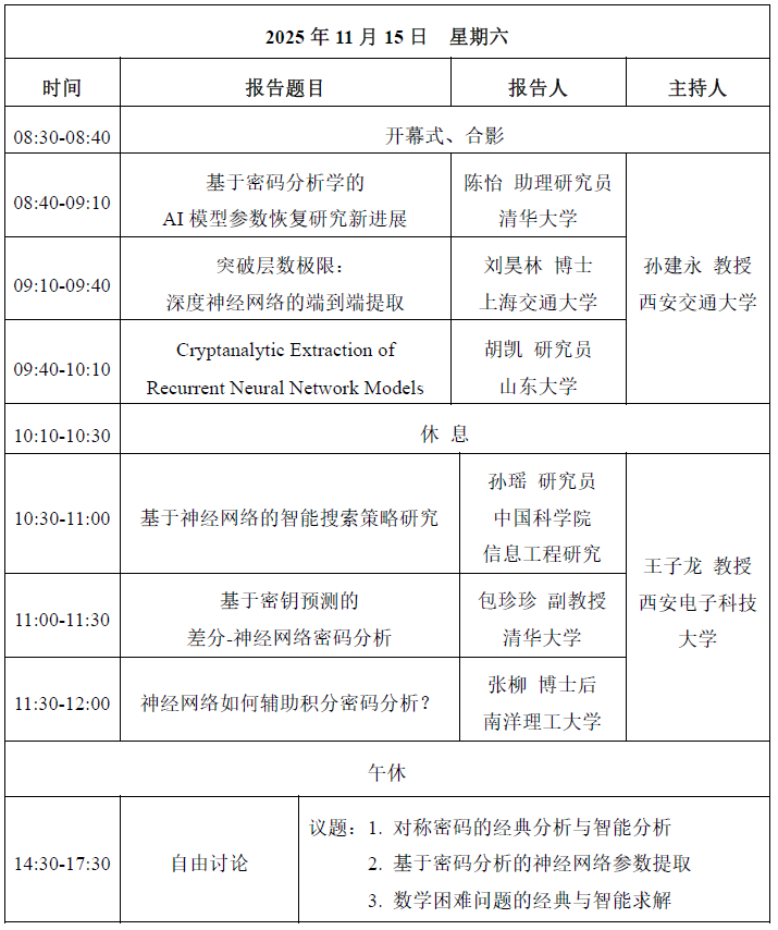 国家天元数学西北中心将于2025年11月15日至16日举办“密码与智能交叉研究”前沿学术研讨会。研讨会聚焦对称密码的经典分析与智能分析、基于密码分析的神经网络参数提取和数学困难问题的经典与智能求解,深入探讨密码分析与人工智能方法的融合创新。会议将邀请国内外人工智能和密码分析领域的顶尖学者开展深入交流,推动相关领域的前沿创新与突破性发展。