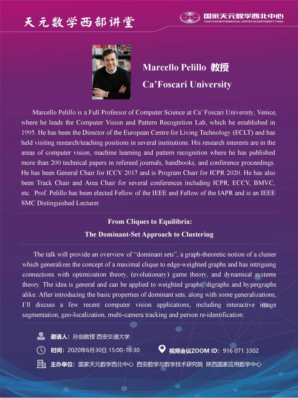 【天元数学西部讲堂】 From Cliques to Equilibria:The Dominant-Set Approach to Clustering(2020.06.30)