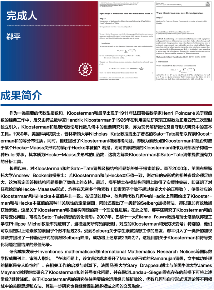 十大数学理论成果(二)成果名称:Kloosterman和Sato-Tate猜想及模结构问题的研究