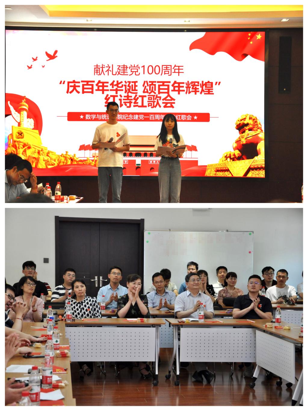 在数学楼2-1会议室举办“庆百年华诞,颂百年辉煌”红诗红歌会。学院党委书记颜莉,院长赵彬,党委副书记李义宝,副院长易媛、肖燕妮,以及学院教师代表、学生党员代表等共同参加演出。