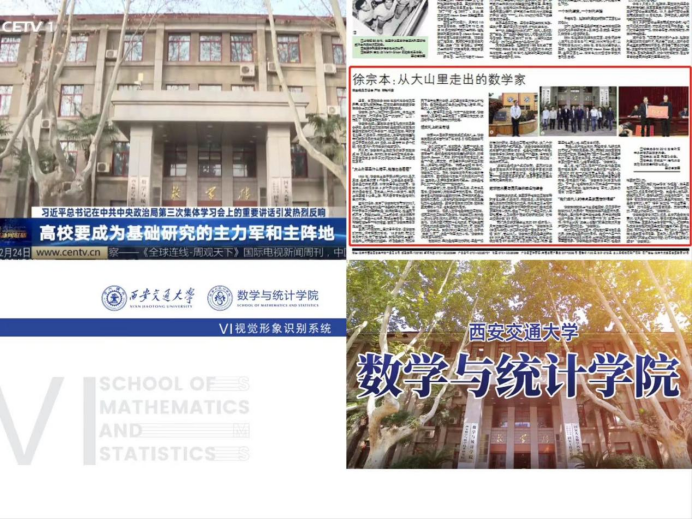 内外兼修弘扬数学文化。学院注重文化内涵建设和创新,推出全新学院视觉形象系统,拍摄学院宣传片,推进数学文化墙建设,筹备拍摄原创大先生话剧《人民科学家吴文俊》等,通过丰富多样的形式,传播数学文化,展示数学魅力。同时,学院紧密围绕教学科研中心工作,深入师生挖掘先进典型,讲好学院故事,传递数学声音,学院先进人物和典型事迹先后被瞭望新闻周刊、中国教育电视台、《中国科学报》、《陕西日报》等媒体报道。