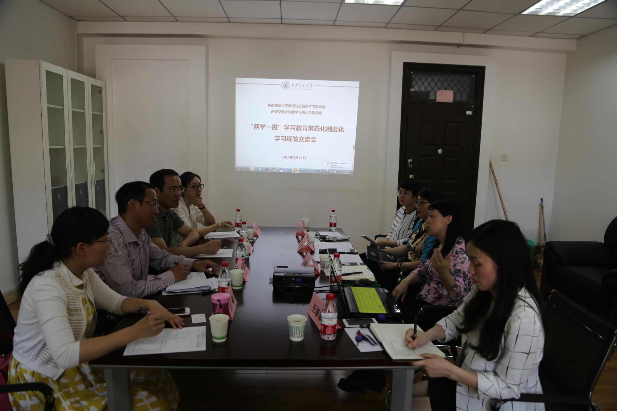 王荷风书记代表数学学院欢迎陕西师范大学同行的到来,并就我校“两学一做”学习教育常态化机制的相关要求和学院在“两学一做”学习教育中开展的工作情况进行详细介绍。双方聚焦如何提升教工党支部工作的积极性、完善“三会一课”制度、如何以党建为龙头祝好师德师风建设等问题展开深入讨论。易媛副书记以所在教工党支部为例介绍了学院教工党支部工作开展情况,包括鼓励年轻教师担任支部书记,建立支部传帮带机制、充分发挥年长教师对年轻教师的指导作用,关心和帮助支部成员成长和发展等。