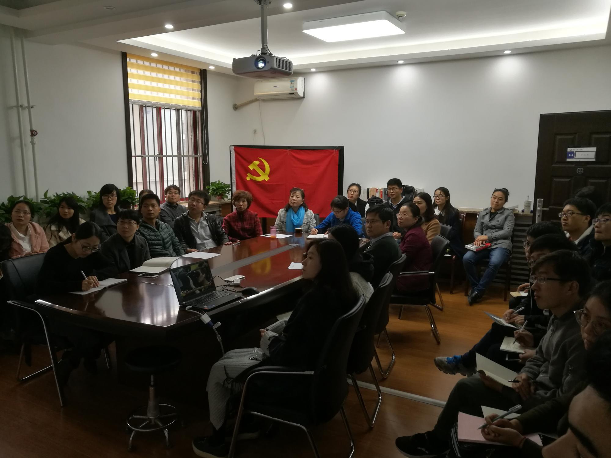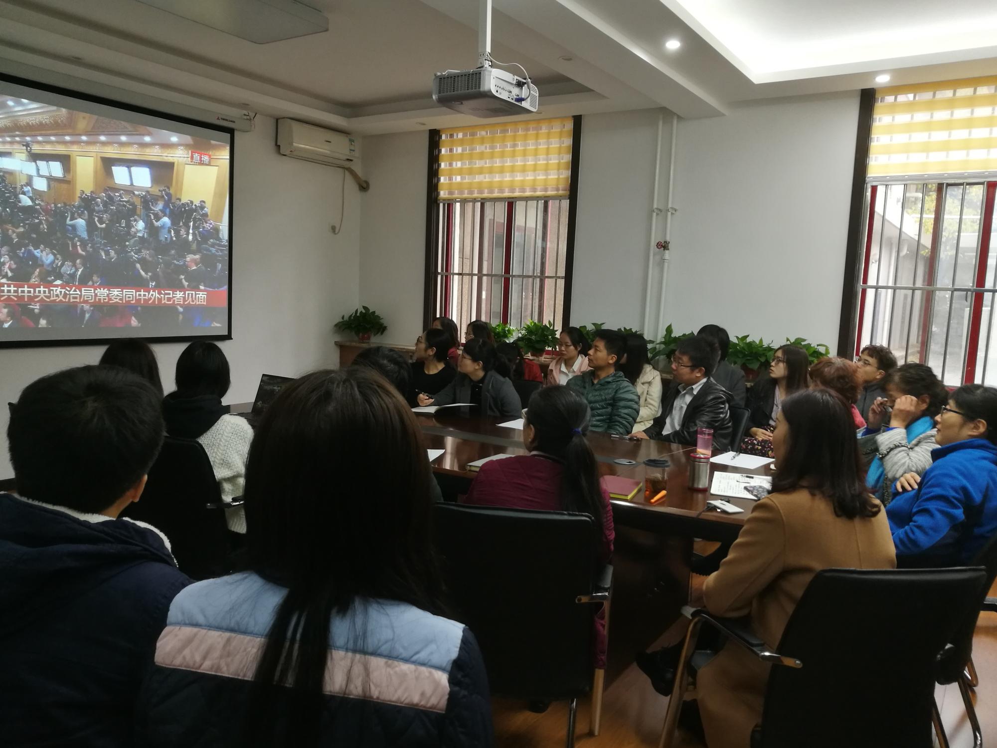 组织学院师生党员代表在112会议室观看见面会,分党委副书记易媛、学院青年骨干教师代表、机关党支部成员和学生党员代表等一起观看了实况直播。