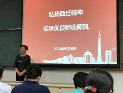 在中二-3219召开以“弘扬西迁精神,传承优良师德师风”为主题的第34个教师节暨第二个西迁纪念日庆祝大会,学院全体教职工及2018级研究生新生参会,会议由分党委副书记颜莉主持。