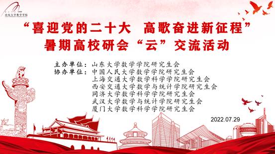 、中国人民大学、上海交通大学、同济大学、武汉大学、厦门大学等7所高校数学学院研究生会共同开展“喜迎党的二十大 高歌奋进新征程”暑期高校研会“云”交流活动。各兄弟院校分享了研会建设、品牌活动开展经验,充分交换意见,对未来进一步的交流合作达成共识!