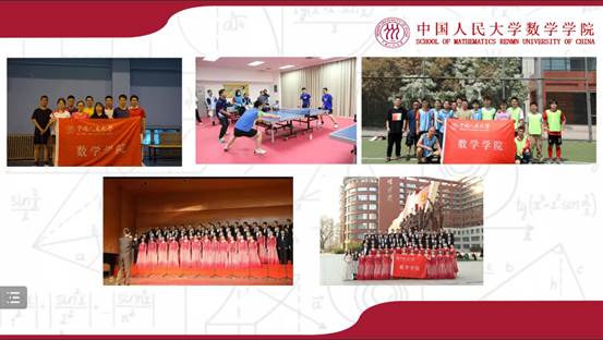 中国人民大学数学学院研究生会下设组织部、发展规划部以及宣传部,从文体、学术、就业开展,以学生需求为出发点,分享学院举办的文体、学术、就业等方面的活动,促进生生、师生关系和谐发展。