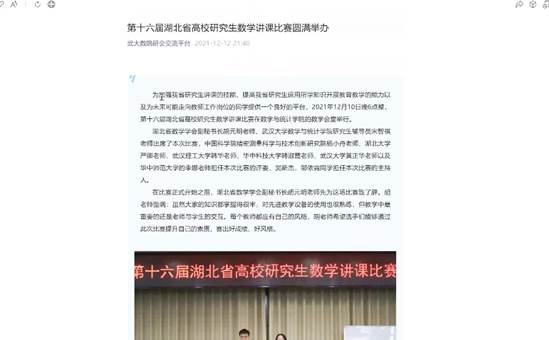 研究生会连续多年举办了湖北省高校研究生数学讲课比赛、湖北省高等院校数学论坛,也开展了一些走进企业的参观交流活动。